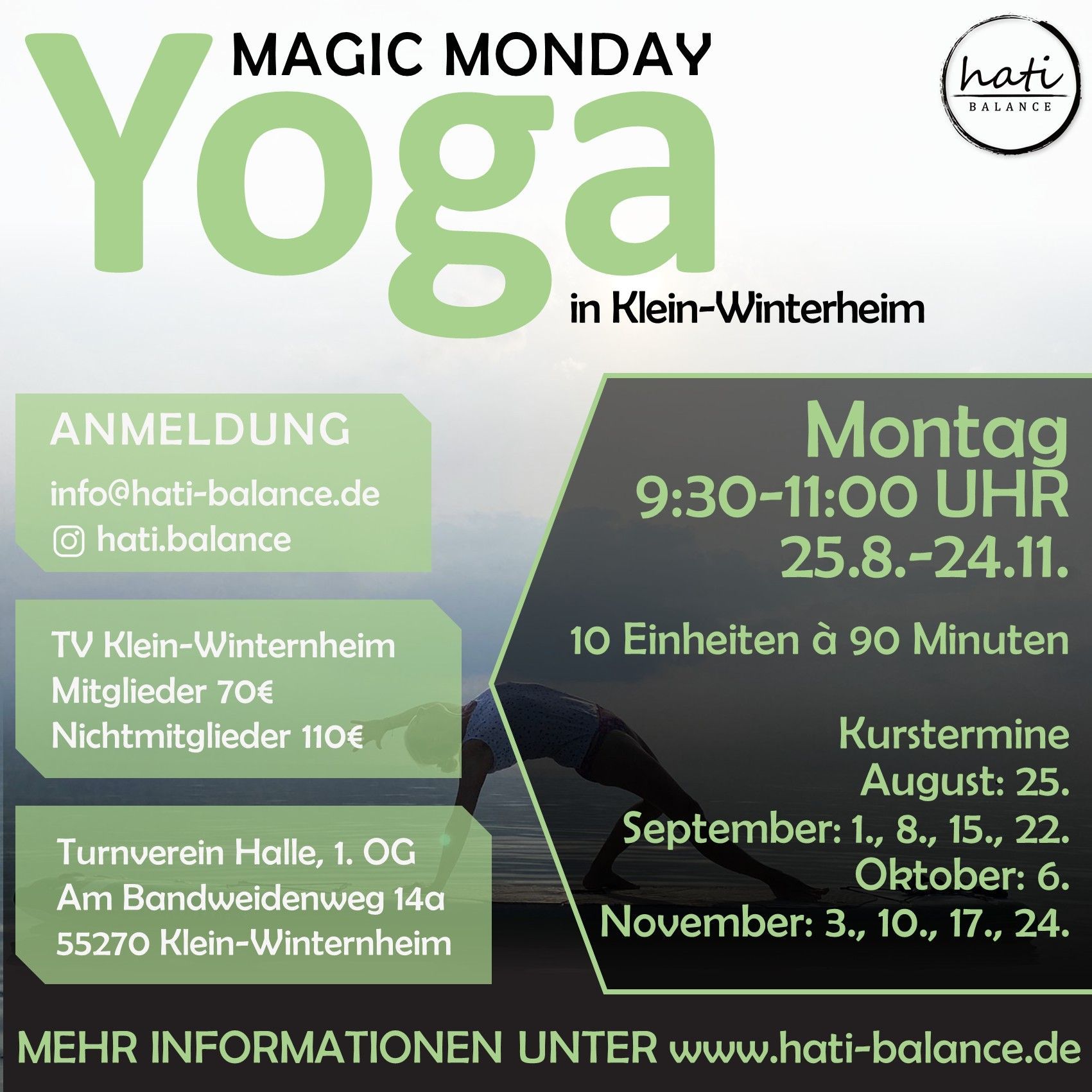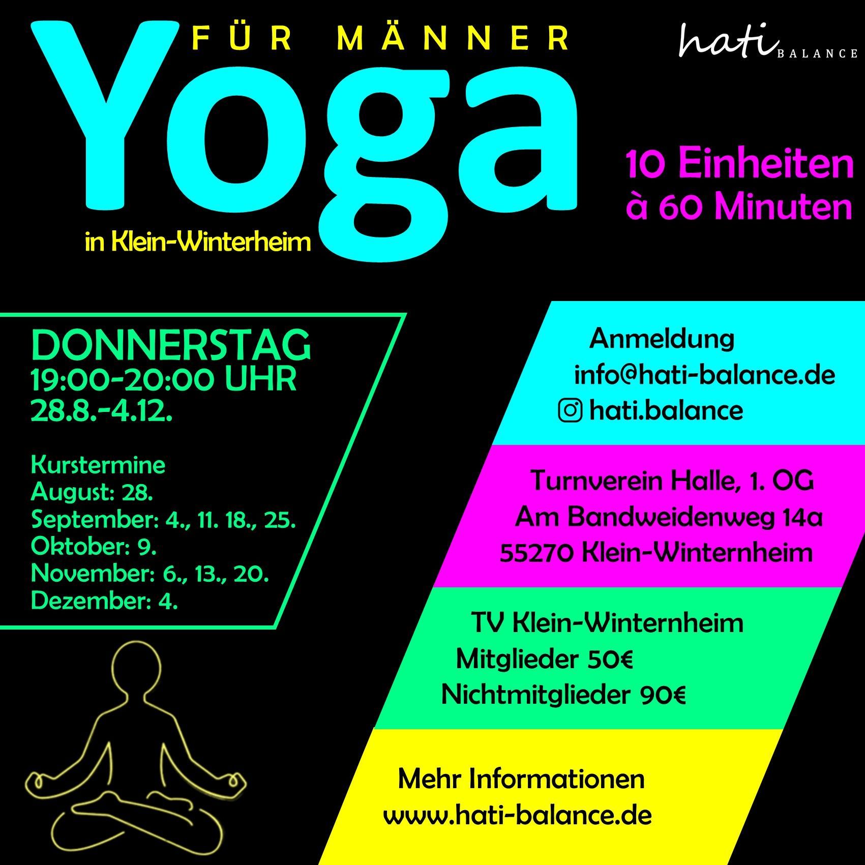 In Klein-Winternheim biete ich über den Turnverein drei unterschiedliche Yoga-Kurse an, die sich gezielt an verschiedene Bedürfnisse richten. Alle Stunden finden regelmäßig als geschlossene Kurse in der Turnhalle des Vereins statt und sind auch für Nichtmitglieder buchbar.